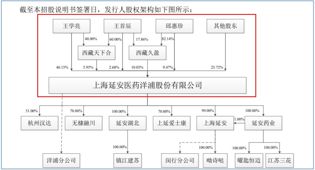 招股书显示,延安医药实际控制人为王学亮和邱慧珍夫妇,王学亮直接持有公司46.15%的股份,并通过西藏天下合控制公司5.95%的股份;邱慧珍直接持有公司9.47%股份,并通过担任西藏久盈执行事务合伙人控制公司10.03%的股份;王学亮、邱慧珍之子王首辰直接持有延安医药2.68%股份。