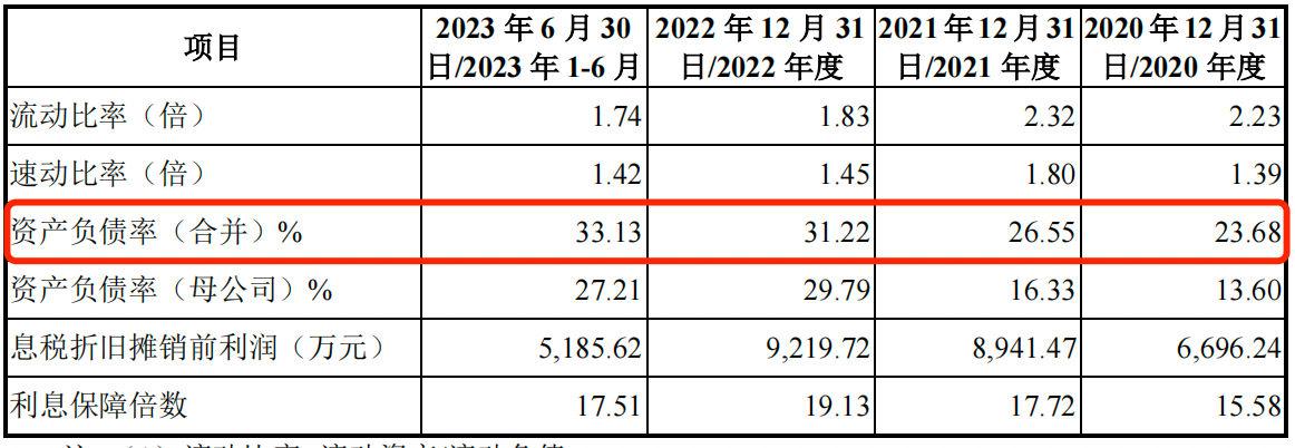 2020年-2023年上半年(以下简称“报告期”),延安医药的资产负债率分别为23.68%、26.55%、31.22%和33.13%,呈直线上升趋势。
