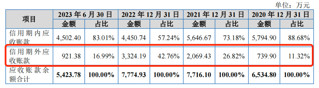 报告期各期末,延安医药超信用期应收账款余额分别为739.90万元、2069.43万元、3324.19万元和921.38万元,占应收账款余额比例分别为11.32%、26.82%、42.76%和16.99%,也就是说,不少客户都延期交付应收账款,2022年这一比例更是超过四成。