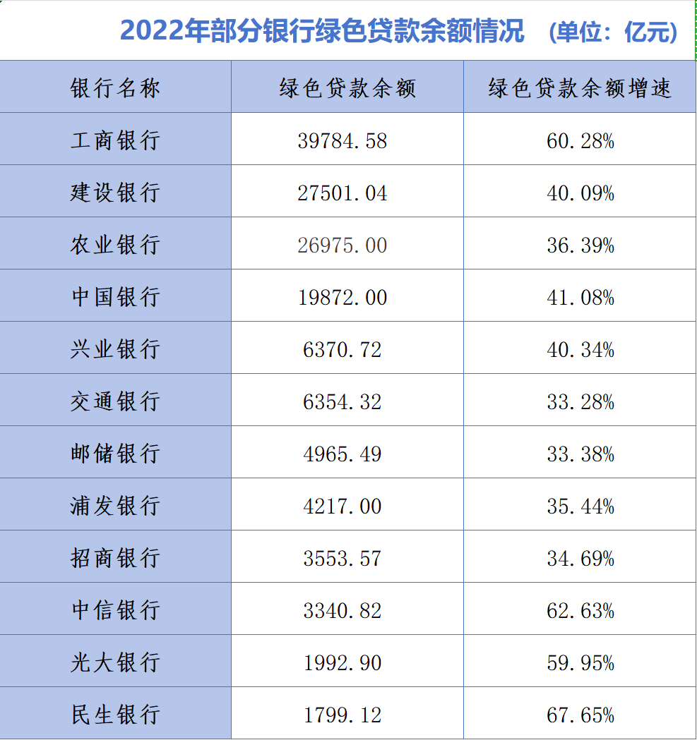 通过观察2022年部分银行绿色贷款余额情况可以看出,工商银行、建设银行、农业银行、中国银行的绿色贷款余额均达到万亿级别,其中工商银行以39784.58亿元的余额位居第一,同时其增速也高达60.28%。