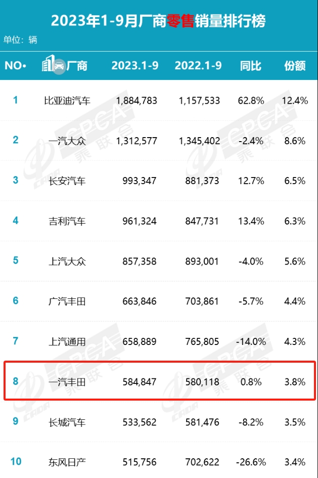 从乘联会公布的销量数据来看似乎并不是这样。一汽丰田前三季度累计销量,是销量前十的车企中,唯一一家实现了增长的合资品牌。