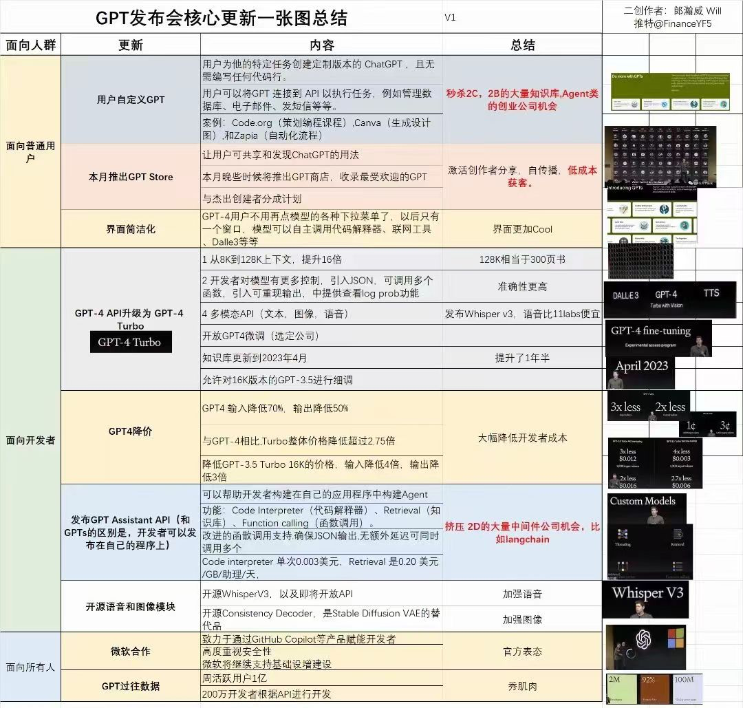 昨天的开发者大会,OpenAI的核心主要围绕两件事,一是工具箱all tools;二是GPT,这其中既包括对过去GPT-4的升级,也包括由GPT更迭演化而来的GPTs、Agents以及GPT Store。