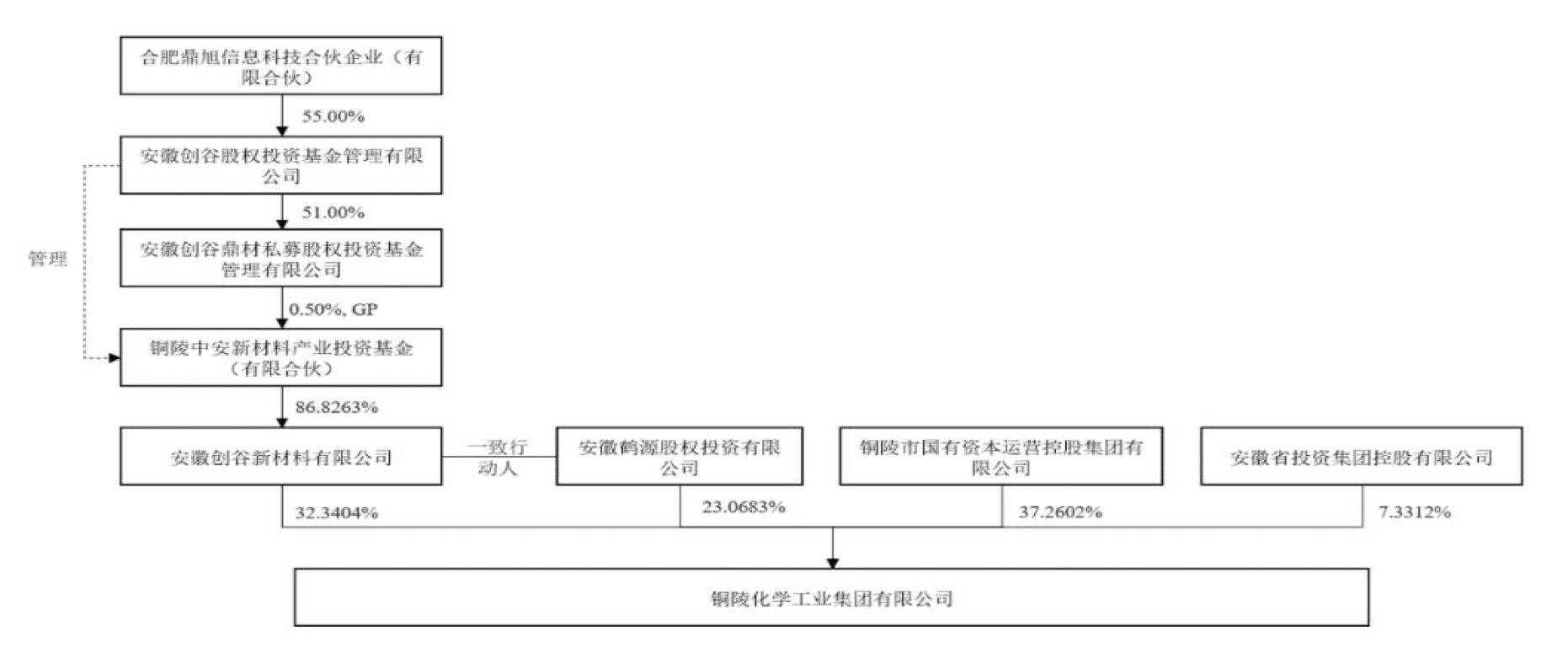 上述的铜陵国控由安徽铜都投资集团有限公司100%控股,实际控制人为铜陵市人民政府国有资产监督管理委员会。铜陵国控持有目标公司铜化集团37.26%股权。上述的创谷新材股东为:铜陵中安新材料产业投资基金(有限合伙)持股86.83%、安徽楚江恒创企业管理咨询有限公司持股13.17%,无实际控制人。创谷新材持有目标公司铜化集团32.34%股权。鹤源投资持有铜化集团23.07%的股权。安徽省投持有剩下的铜化集团7.33%的股权。创谷新材和鹤源投资为一致行动人。