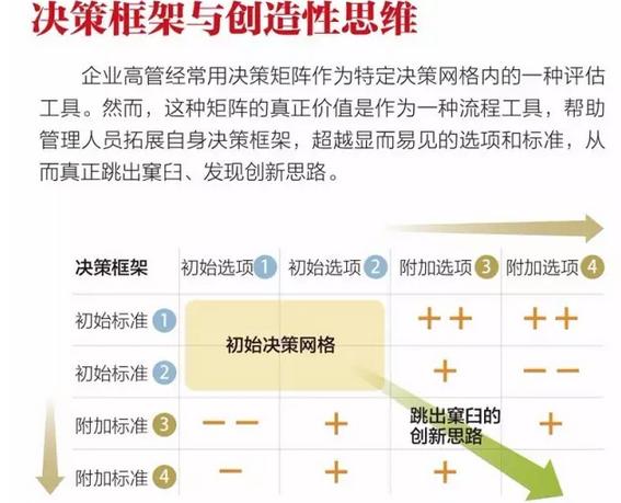 决策矩阵的真正价值并不只是一种评估工具,它还是一种能够帮助管理者拓展自身决策框架的流程工具,让管理者可以不囿于显而易见的选项和标准,跳出窠臼,发现新思路。