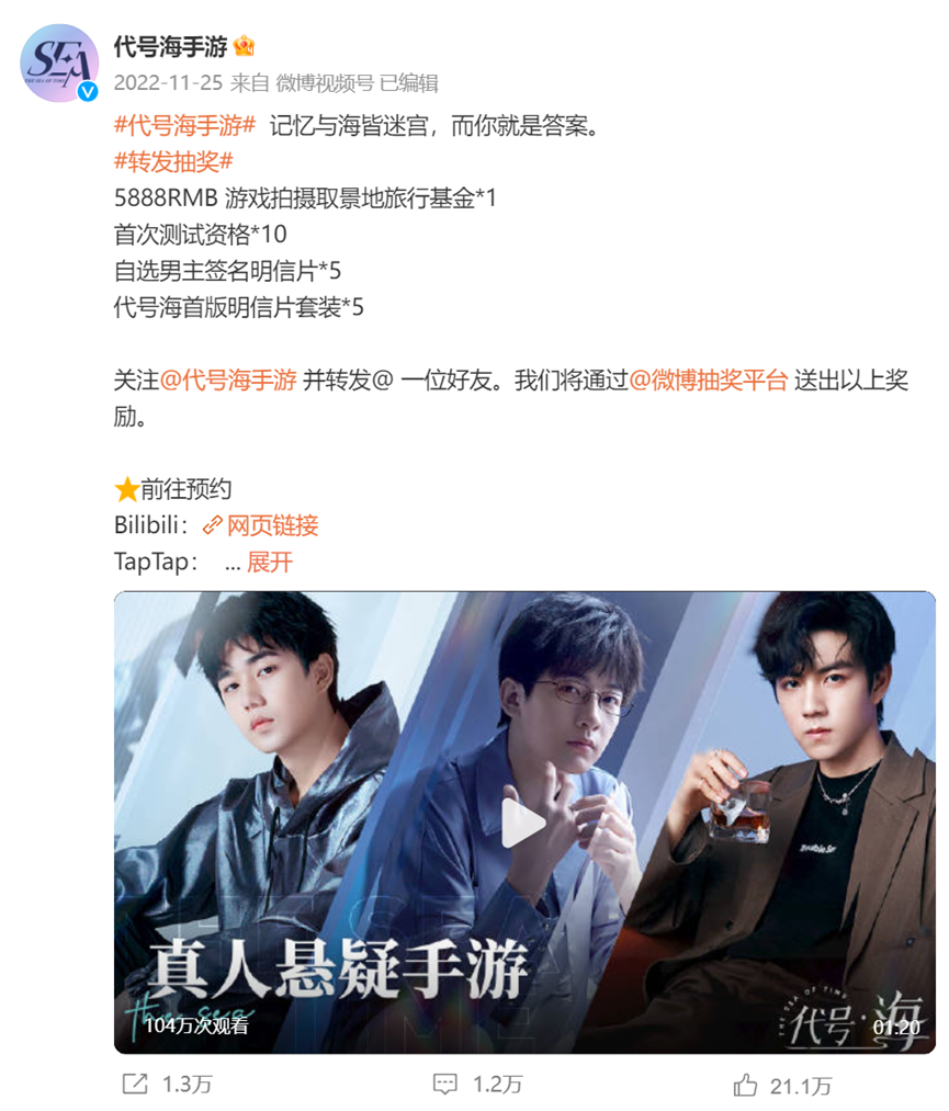 真正让真人女性向游戏有过出圈迹象的,是去年由YOLK工作室宣布的《代号:海》手游,一款标签为“跨次元真人悬疑恋爱”的手游。
