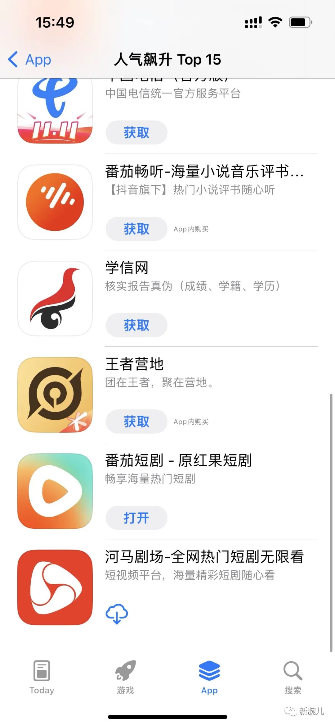 11月7日,新腕儿在苹果应用商店看到,在APP人气飙升榜TOP15中,番茄短剧位列14名,而河马仅次于前者。