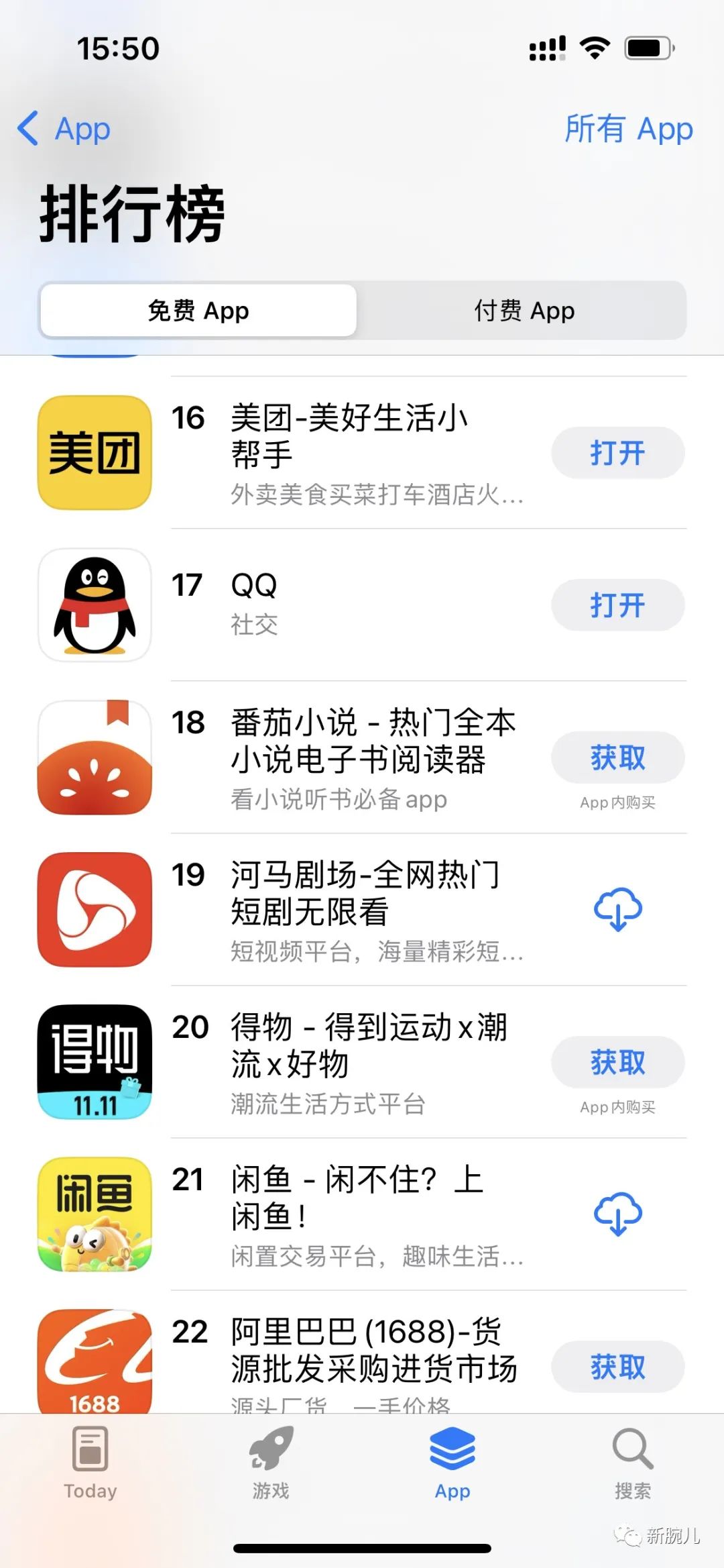还有免费APP下载排行榜中,河马短剧排名19,位列美团、QQ和番茄小说之后,在得物、闲鱼之前。
