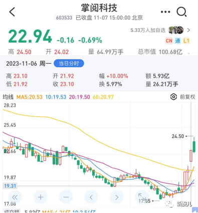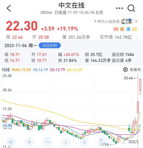 从雪球看到,10月31日,中文在线涨幅一度达到19.19%,报收14.09元/股;在11月2日,该公司涨幅达11.72%,报收15.35元/股;次日涨幅势头短暂走弱,以1.56%的涨幅,报收15.59元/股;到了11月6日,再迎惊喜,涨幅达20.1%,报收18.71元/股,直到11月7日,中文在线仍在上涨,涨幅19.19%,报收22.3元/股。