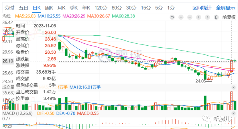 在11月2日股价涨幅9.99%,报收20.81元/股。还在11月6日涨幅10%,报收21.92元/股。在11月7日,便出现下降,跌幅0.69%,至22.94元/股。