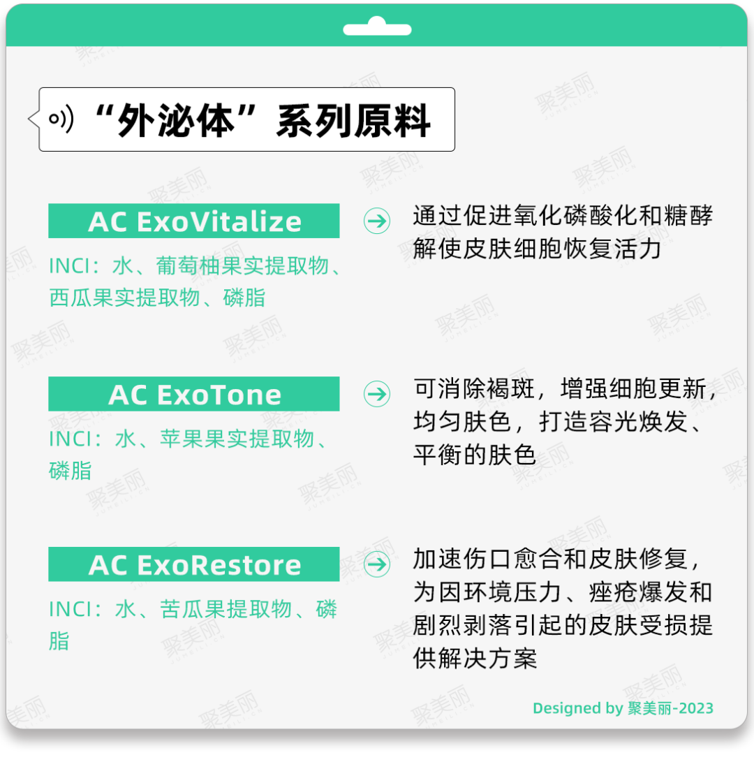 比如,AC ExoVitalize是一种葡萄柚和西瓜提取物的成分组合,主要通过促进氧化磷酸化和糖酵解使皮肤细胞焕发活力,展现更年轻、更紧致的外观;而AC ExoTone来自于升级回收的苹果,可用于消除褐斑、促进细胞更新和均匀肤色。AC ExoRestore则提取自苦瓜,通过外泌体输送系统提升了苦瓜提取物的生物利用度,能够刺激伤口愈合,并为皮肤提供舒缓功效。