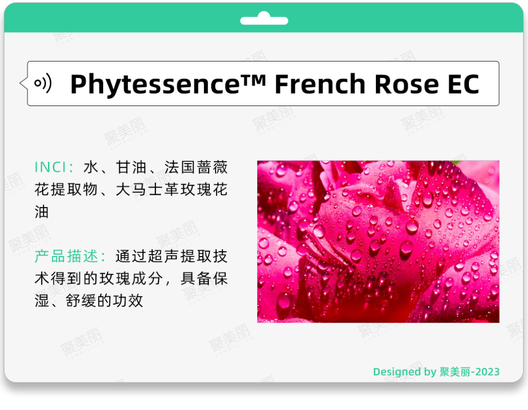 Phytessence French Rose EC是采用了一种Eco-sound 提取技术,即通过超声提取获得玫瑰活性成分,并且在原料提取过程中始终秉持着尊重环境和生物多样性的理念,落实可持续发展。