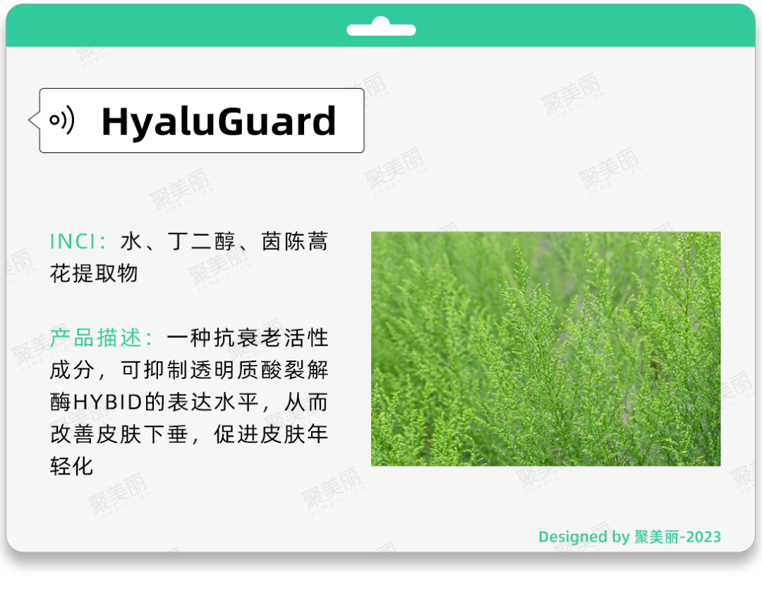 在此研究基础上,日本化妆品活性物制造商一丸生物(ICHIMARU PHARCOS)发现了一种新的化妆品成分 HyaluGuard(INCI:水、丁二醇、茵陈蒿花提取物),可抑制 HYBID的表达水平,使皮肤呈现更加年轻化的状态。