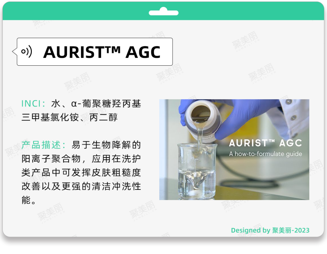 得益于DEB技术的优越性,AURIST AGC不仅易于配制,与多种常用个人护理成分兼容且不需要 pH 中和;而且可作为护发用聚合物被添加到洗护发产品中,也可用于皮肤清洁和沐浴产品配方,从而改善皮肤粗糙感以及产品的清洁性能。