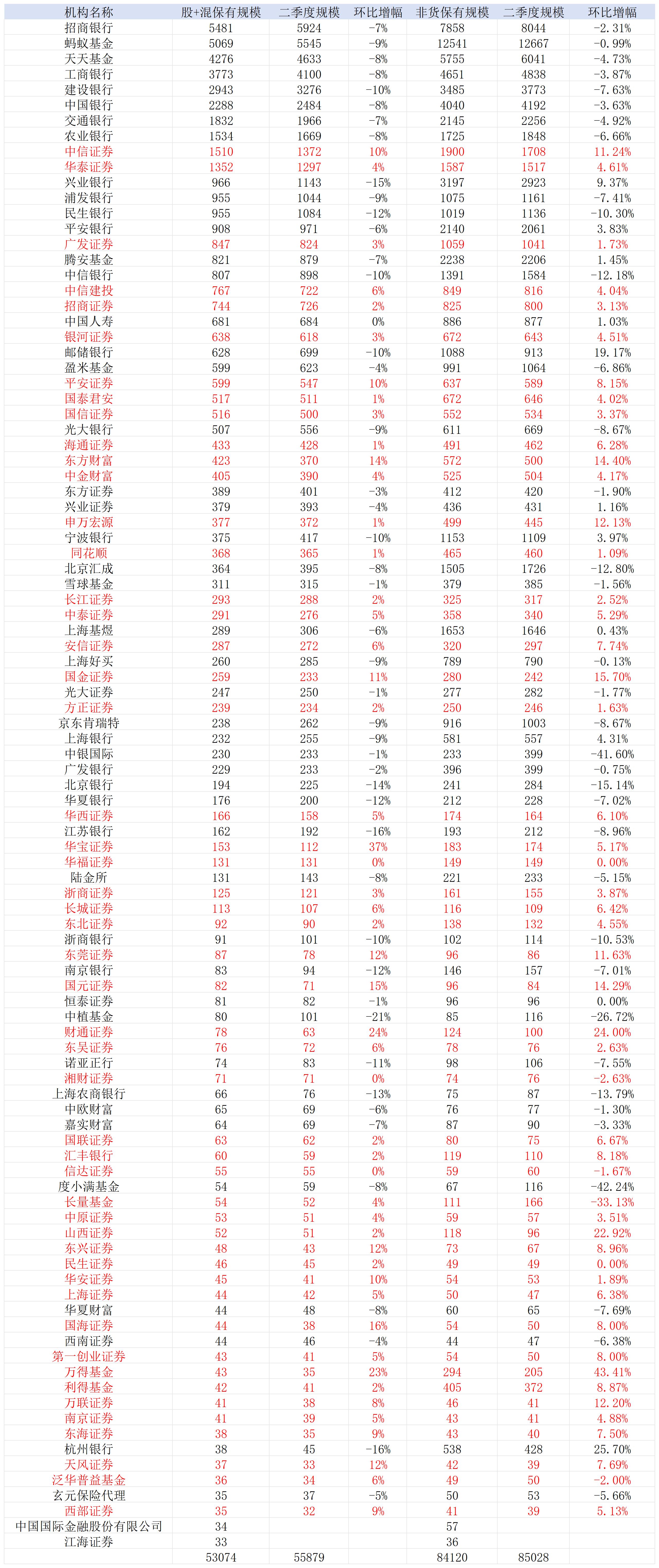 在前100强的名单中,三季度新增了中国国际金融股份有限公司、江海证券两家机构,主动权益保有规模分别为34亿元、33亿元,非货规模为57亿元、36亿元。