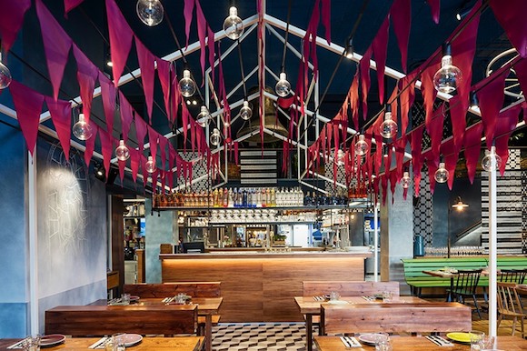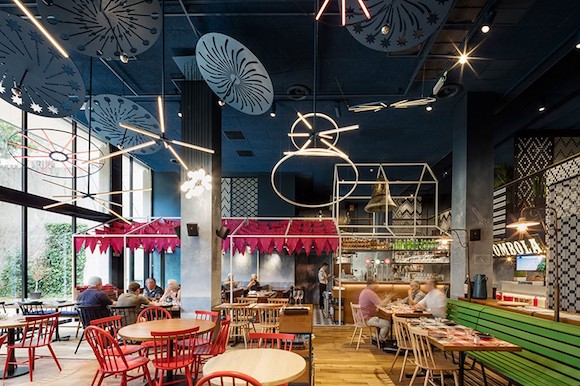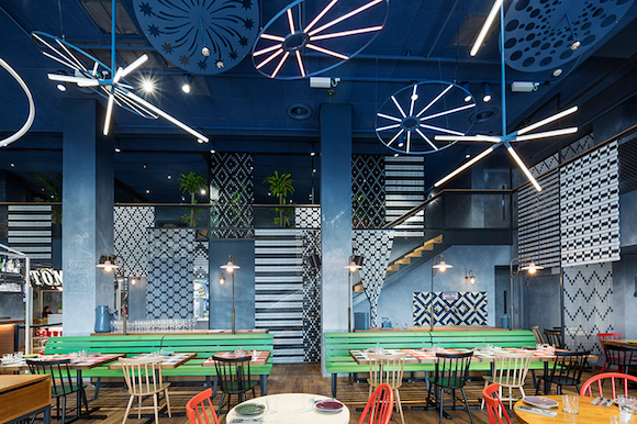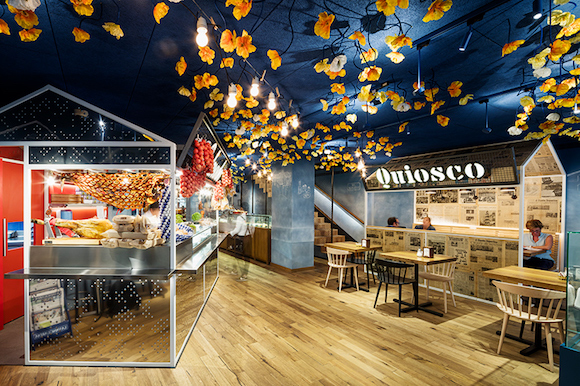 这是西班牙本土事务所El Equipo Creativos的作品。设计公司在1000平方米的二层空间内,参考西班牙小乡村的文化和审美,用不同的主题区块拼凑出了一家清新的田园家庭餐馆。