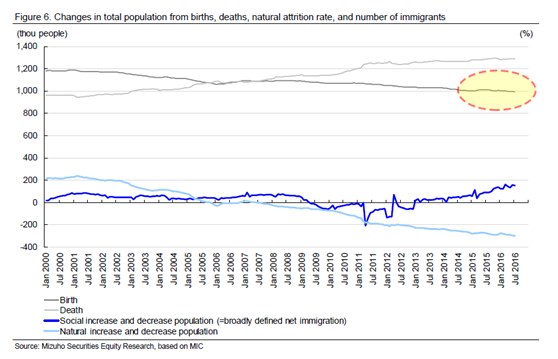 周四,日本内阁批准了2017财年高达830亿美元的支出预算,这包括了对育儿支持。但以这个速度,当地人口在不久的将来可能不需要这笔免费的钱了。如同许多欧洲国家一样,唯一的希望可能是,移民潮的增长将抵消国内人口的自然衰退。