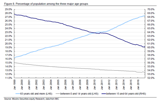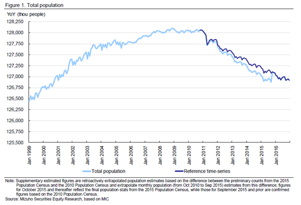 据日本内政部估计,截至2016年12月,日本总人口为1.2692亿,比上年减少了16万(年增长率为-0.13%),已回到了这个世纪初的水平,并还在快速下降。65岁及以上人口占总人口的27.32%,同比增长0.58个百分点;15-64岁人口比例为60.27%,下降0.46个百分点;0-14岁人口比例12.41%,下跌0.11个百分点。