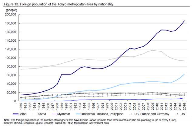 尤其中国人、东南亚人(特别是越南人)和南亚人(特别是尼泊尔人)在东京定居的人数有大幅的净增长。