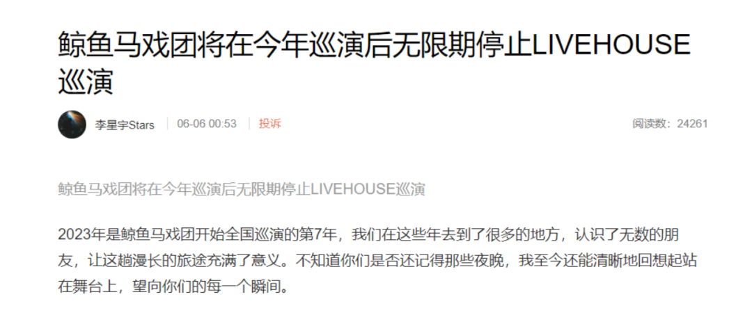 今年6月鲸鱼马戏团乐队就宣布,将在今年巡演无限期停止Live House巡演。