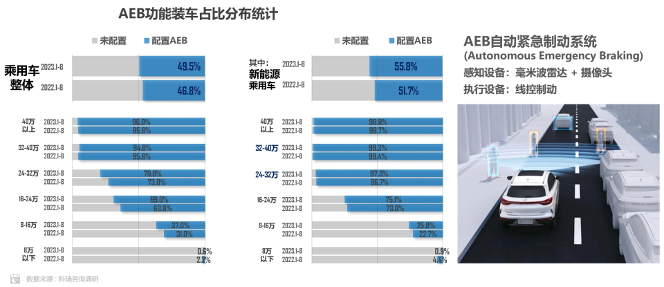 事实上,乘联会最新报告指出,AEB作为重要的主动安全功能,在今年上市的大多新车中已实现全系标配。从整体来看,截至今年年中,乘用车配置AEB功能占比为49.5%,其中新能源车配置该功能占比稍高,达到55.8%。而16万元以上的乘用车对于该功能的普及率已达到67%。