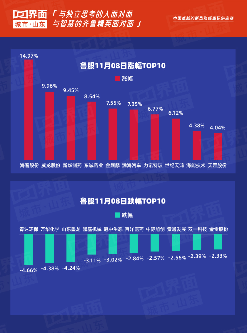 11月8日,山东119只个股上涨,178只个股下跌。