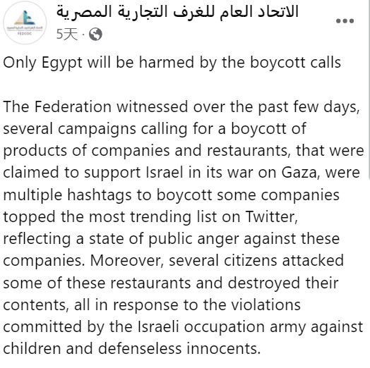 声明指出,目前被抵制的欧美品牌在埃及的经营方式大部分为特许经营,门店雇用的是埃及人,交税交给埃及当局。除此之外,埃及分店的营业额仅占相关品牌全球营业额的1%以下,因此抵制行动不会对相关品牌的母公司产生任何实质影响。