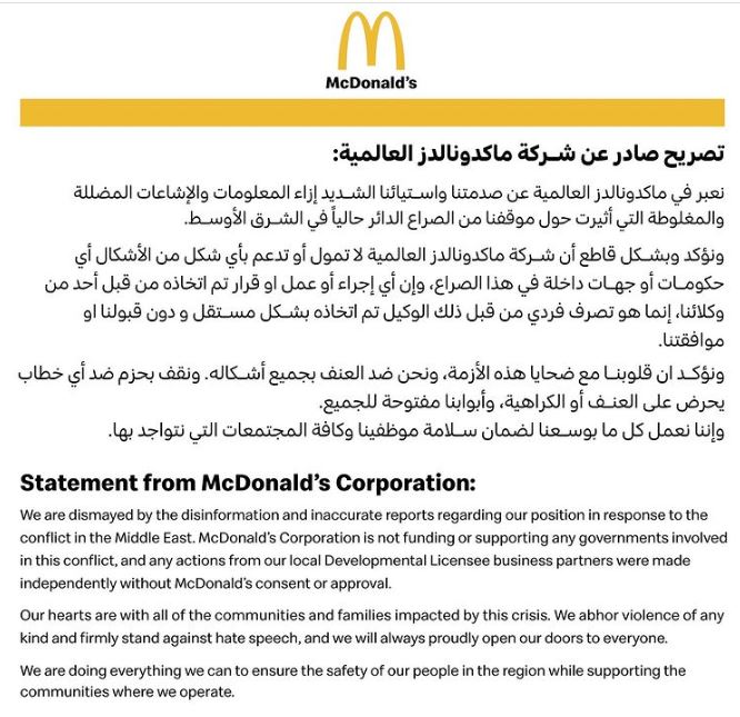 土耳其、约旦、埃及、黎巴嫩、科威特等国的麦当劳纷纷发声明,强调以色列麦当劳的决定与其他麦当劳分店无关。科威特、阿联酋、卡塔尔等国的麦当劳还宣布为加沙地带提供援助金。