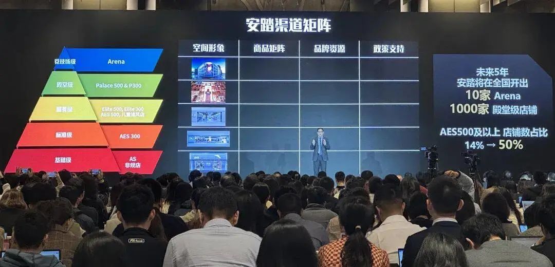在10月17日的安踏投资者日活动上,徐阳提出安踏品牌进一步高端化的目标。他计划将零售业态分成竞技场级(Arena)、殿堂级(Palace)、精英级、标准级和基础级,而未来的拓店重点则是五年内的10家竞技场级店铺和1000家殿堂级店铺。
