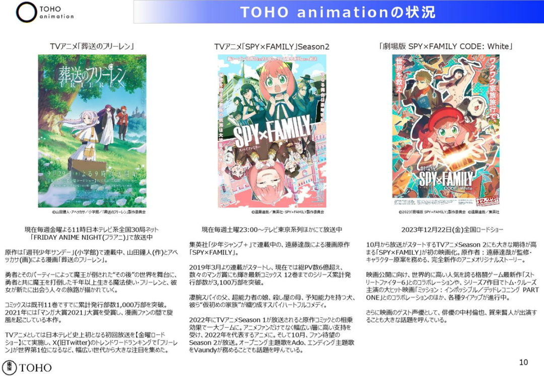 此外,从10月开始,NTV特设了动画播出时段“FRIDAY ANIME NIGHT”(每周五23时)。目前在播的主要动画包括经典IP《面包超人》《名侦探柯南》《葬送的芙莉莲》《药师少女的独语》,其中后两部一经播出都获得了较高关注度。
