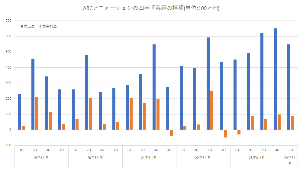 ABC动画各季度经营状况(蓝色:销售额,橘色:营业利润)