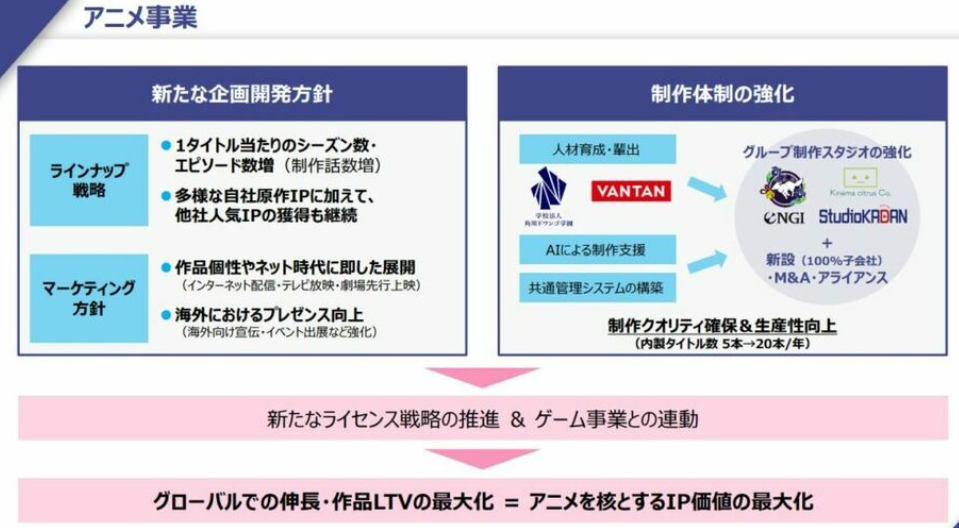 这一战略可以说是受到了竞争对手公司动向的影响。Aniplex、万代均手握大量IP,控制着作品的国内外商业化,角川也将以这种商业模式为目标。