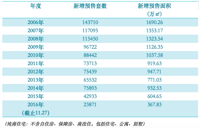 2014年北京纯商住宅用地的成交规划建面仅200万平方米,造成2015年预售面积锐减至604.65万平方米,而2015年仅成交300万平方米纯商住宅用地,依然保持低位,造成2016年新增预售面积尚不足400万平方米。亚豪机构对此预测,“预计明年形势更加严峻,今年仅出让42万平方米可售纯商住宅,将直接导致明年住宅预售量的进一步重挫。”