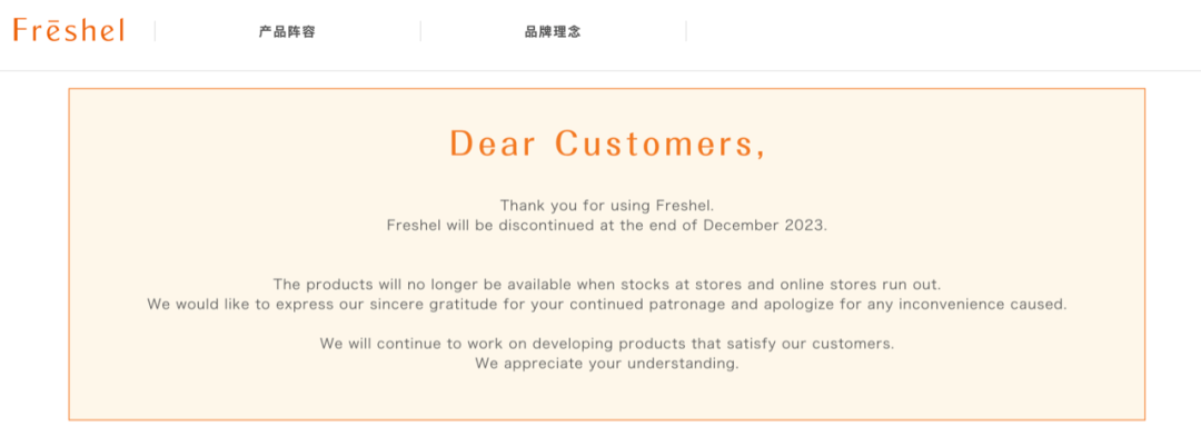 近日,Frēshel在其官网发布了一则声明。声明表示,品牌将于2023年12月底停产。当实体店和网店的库存售罄后,产品将不再补售。官网显示,目前,Frēshel旗下有包括清洁霜、化妆水、乳液在内的11款单品。