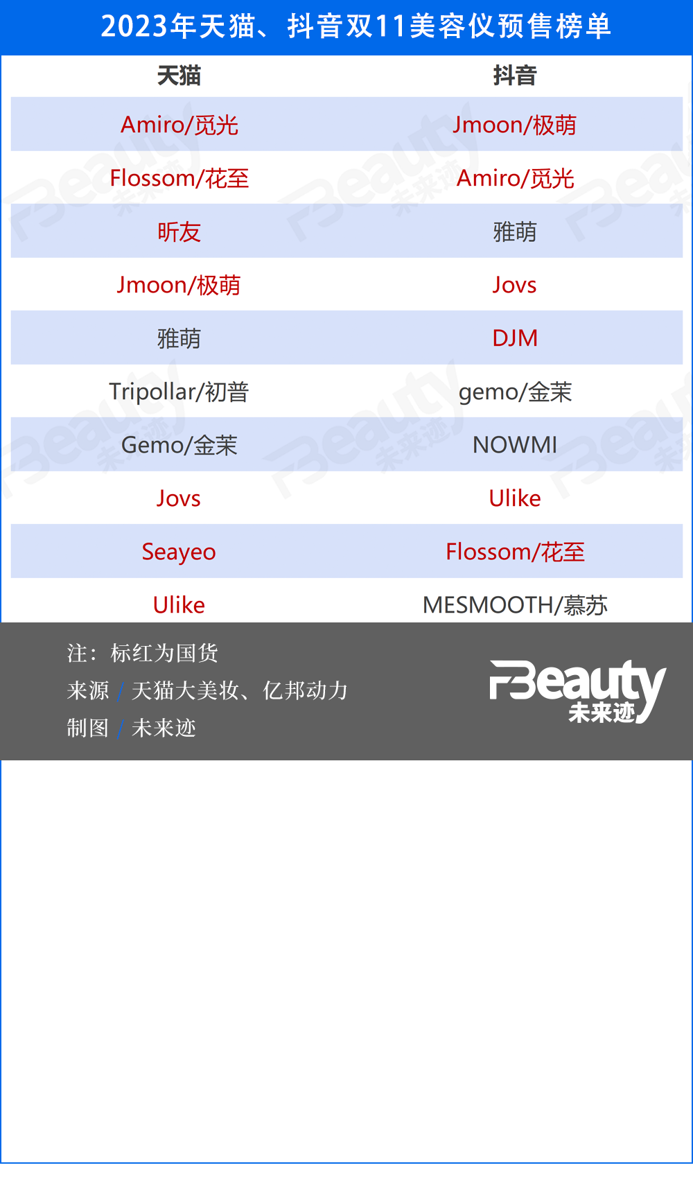 就今年双十一的预售情况来看,国货美容仪品牌已经从销量和数量上全面超越进口品。天猫平台的前十名中,国产品牌与外资品牌的比例为7:3,抖音平台的比例则为6:4,数量均超过外资品牌。同时,国产品牌的排名都靠前,在天猫平台国产品牌占据了前4名,而在抖音平台国产品牌占据了前2名。