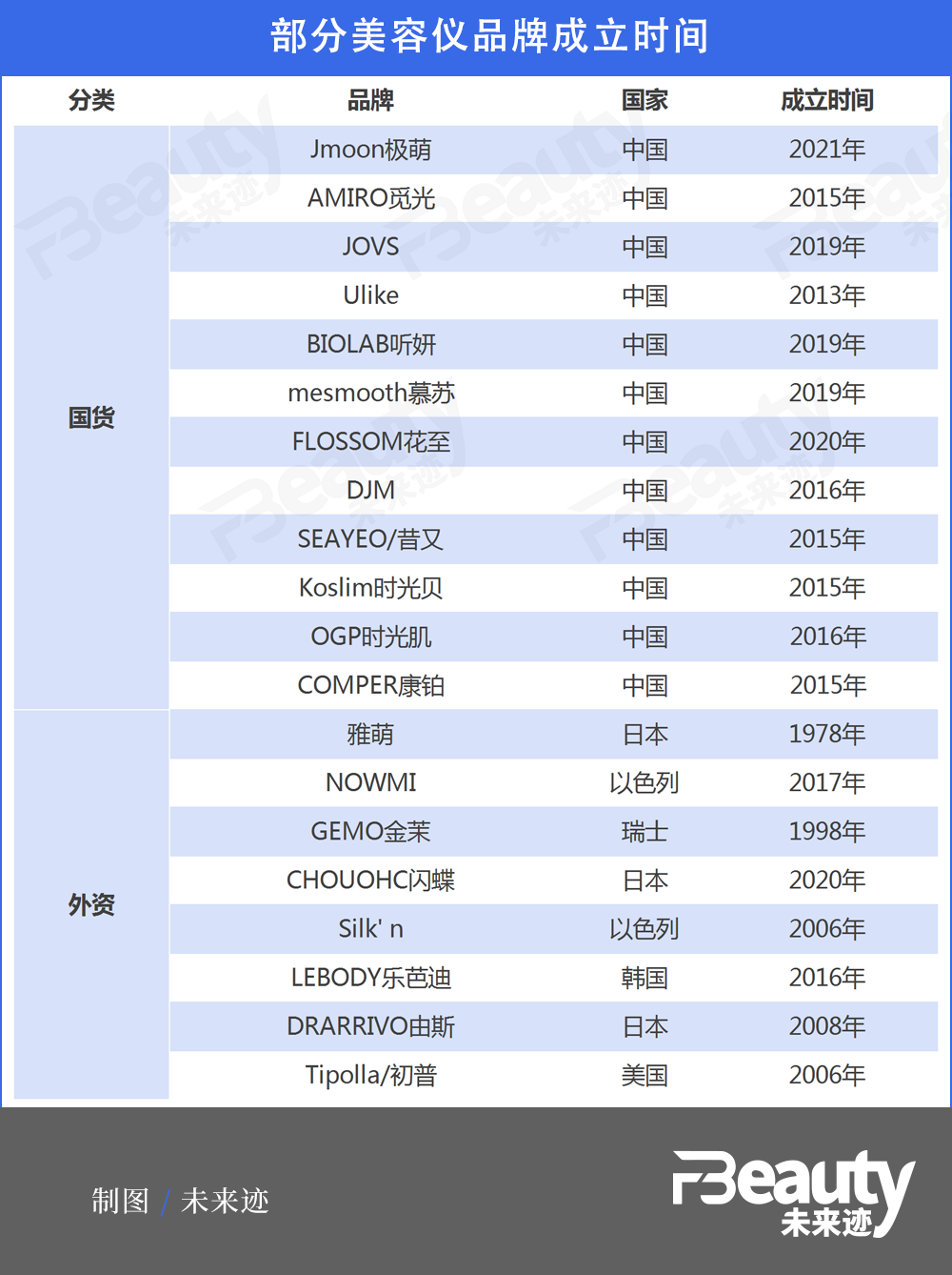 梳理目前市面上主要美容仪品牌的成立时间,可以发现中国品牌成立时间都较晚,主要集中在2015年之后,Jmoon极萌是2021年才成立,但至今已多次冲上各平台销量榜第一。外资品牌成立时间较早,例如日本品牌雅萌成立于1978年。