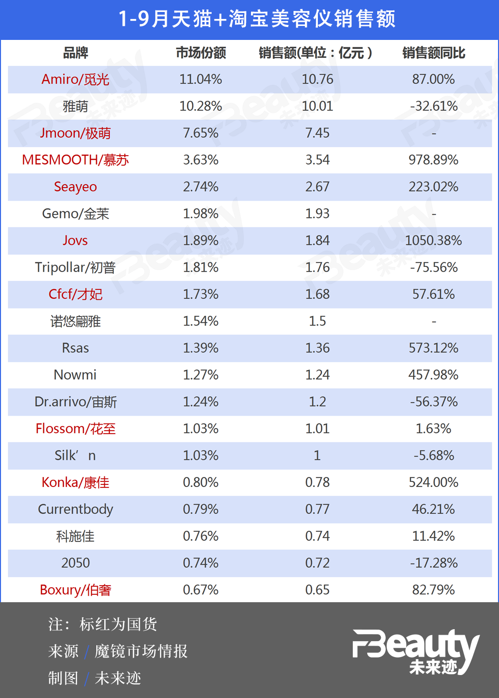 就销售额的情况来看,Amiro觅光的销售额达10.76亿元,与第二名雅萌的10.01亿元较为接近。同时,Seayeo、cfcf才妃、flossom花至等国产品牌的销售额均呈上升趋势,而雅萌、Tripollar初普、Dr.arrivo宙斯等外资品牌均有所下降。