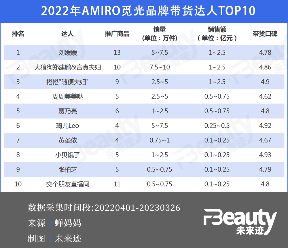 随即觅光在品牌自播、短视频种草、达人直播等多方面全面发力。2022年,觅光通过10位品牌达人带货,销售额就超过了10亿元。蝉妈妈数据显示,2022年觅光关联的达人数量就超过了900个,全面覆盖明星、达人各个群体。