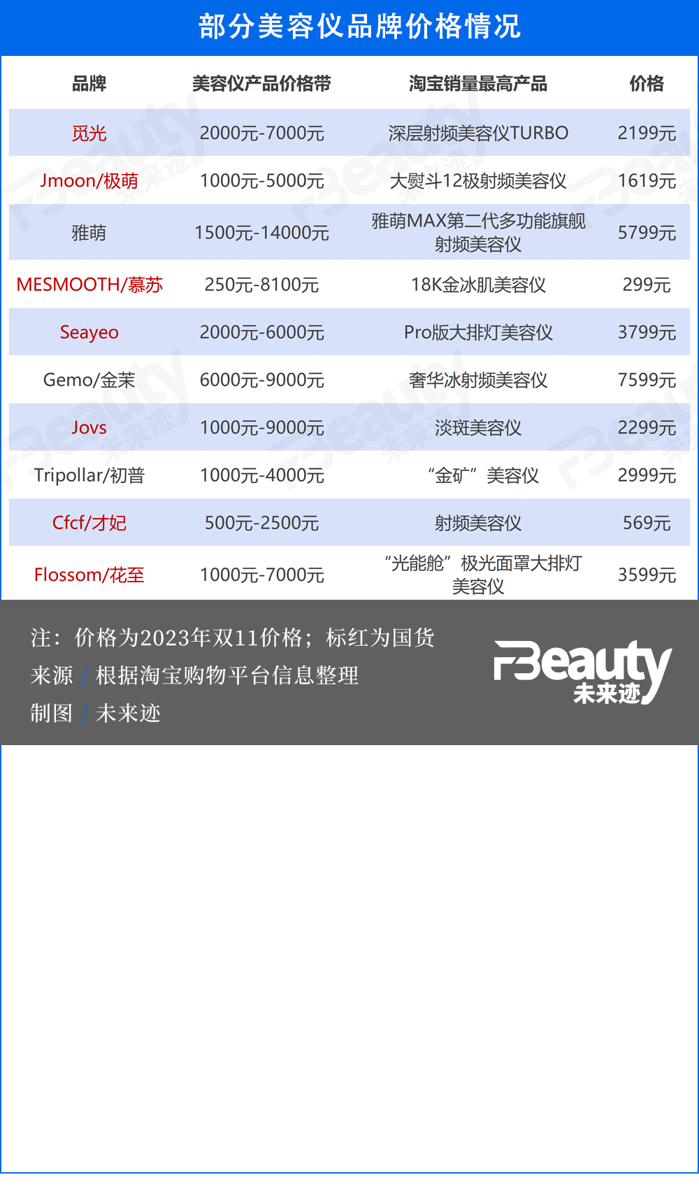 经过一轮发展之后,国产美容仪品牌不再以“高性价比”著称,相反,其产品价格覆盖了各个层级。如觅光的产品价格带横跨2000到7000元,均价较低的才妃,其价格带也横跨500到2500元。