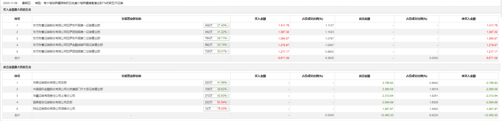 11月9日,太龙药业今日跌停,全天换手率29.52%,成交额12.68亿元,振幅14.12%。龙虎榜数据显示,营业部席位合计净卖出5781.11万元。上交所公开信息显示,当日该股因日跌幅偏离值达-10.07%上榜,营业部席位合计净卖出5781.11万元。