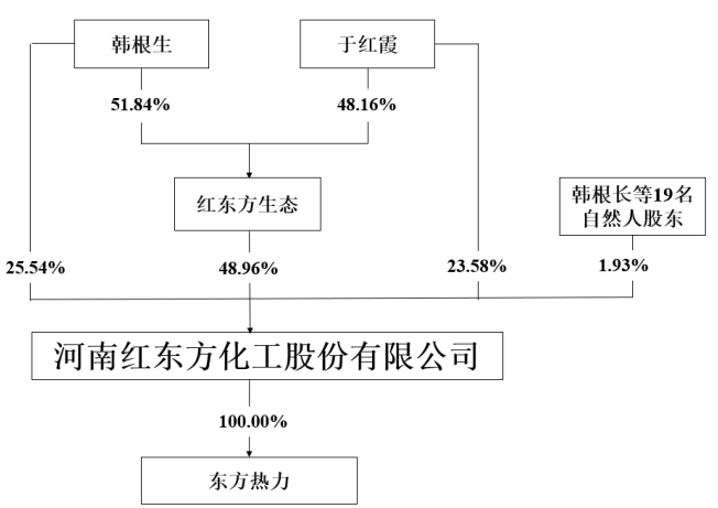 通过两人100%控股公司红东方生态持有红东方48.96%股权,韩根生和于红霞直接或间接持有红东方98.07%股权。
