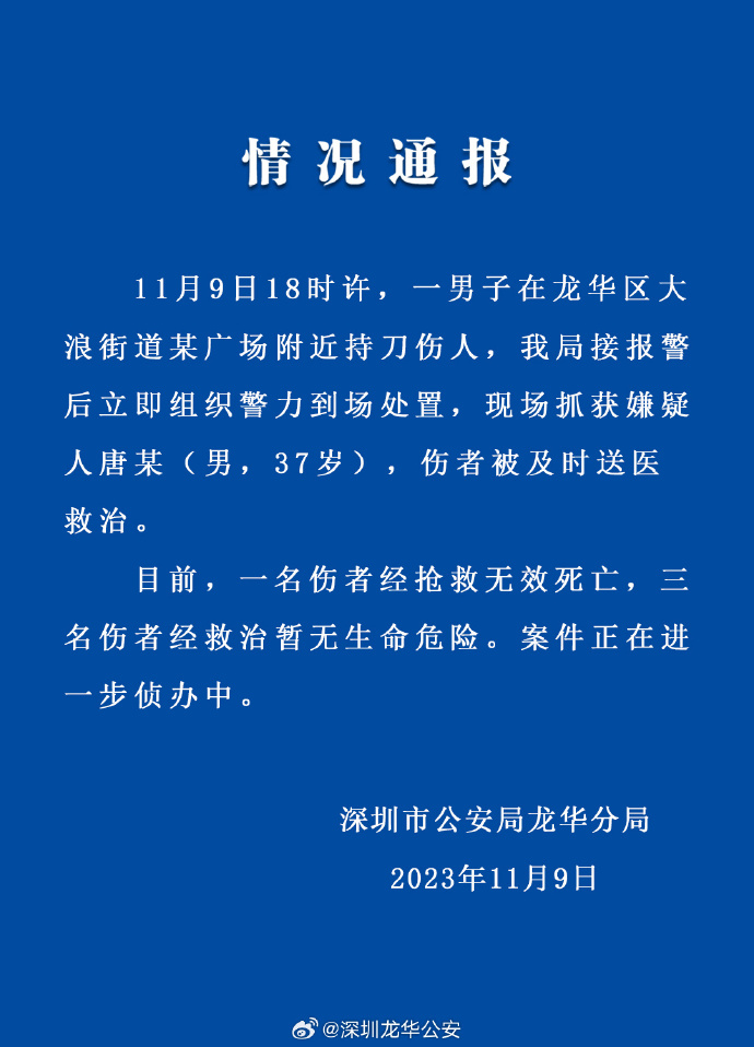 深圳市公安局龙华分局发布情况通报,11月9日18时许,一男子在龙华区大浪街道某广场附近持刀伤人,我局接报警后立即组织警力到场处置,现场抓获嫌疑人唐某 (男,37岁),伤者被及时送医救治。