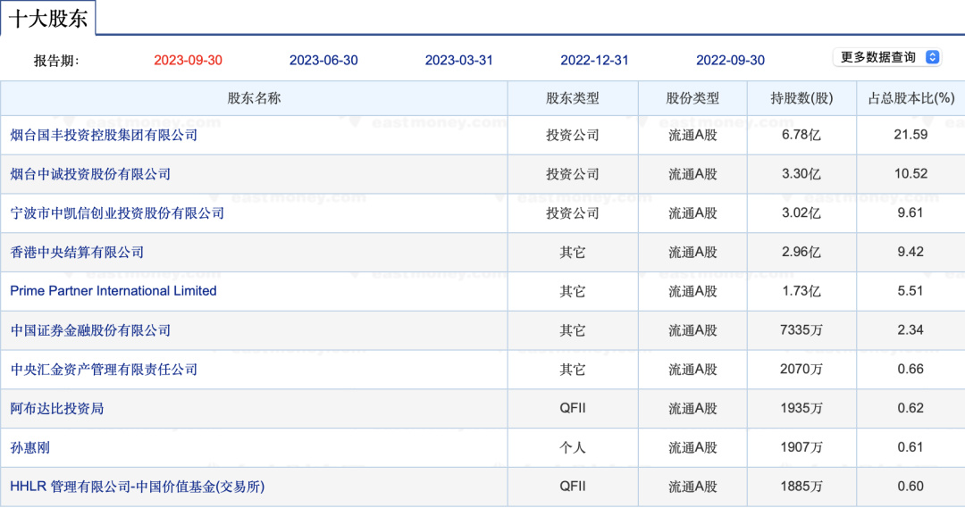 万华化学前十大股东(来源:东方财富网数据中心)