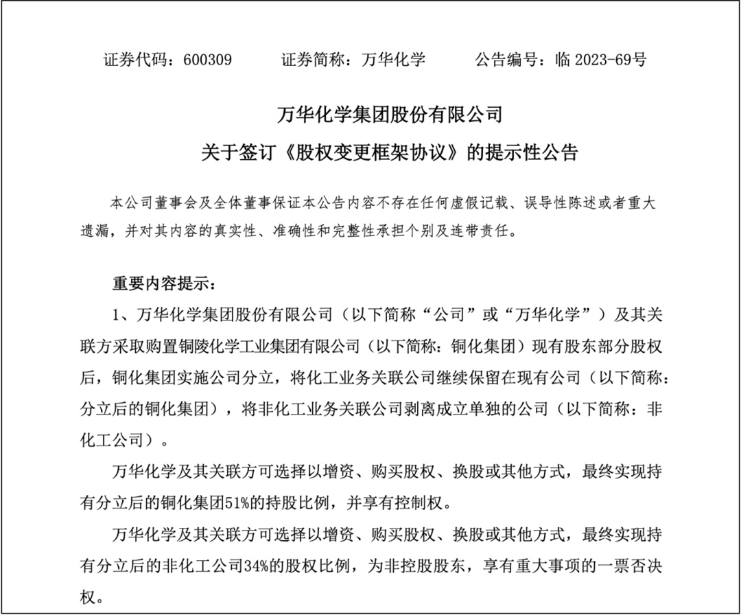 根据并购协议,万华化学购入股权后,铜化集团将一分为二:化工业务继续保留在现有公司,非化工业务将剥离成立单独公司。对前者化工铜化,万华化学将成为控股股东,股权占比51%;对非化工铜化,万华化学将成为第一大股东,股权占比34%。