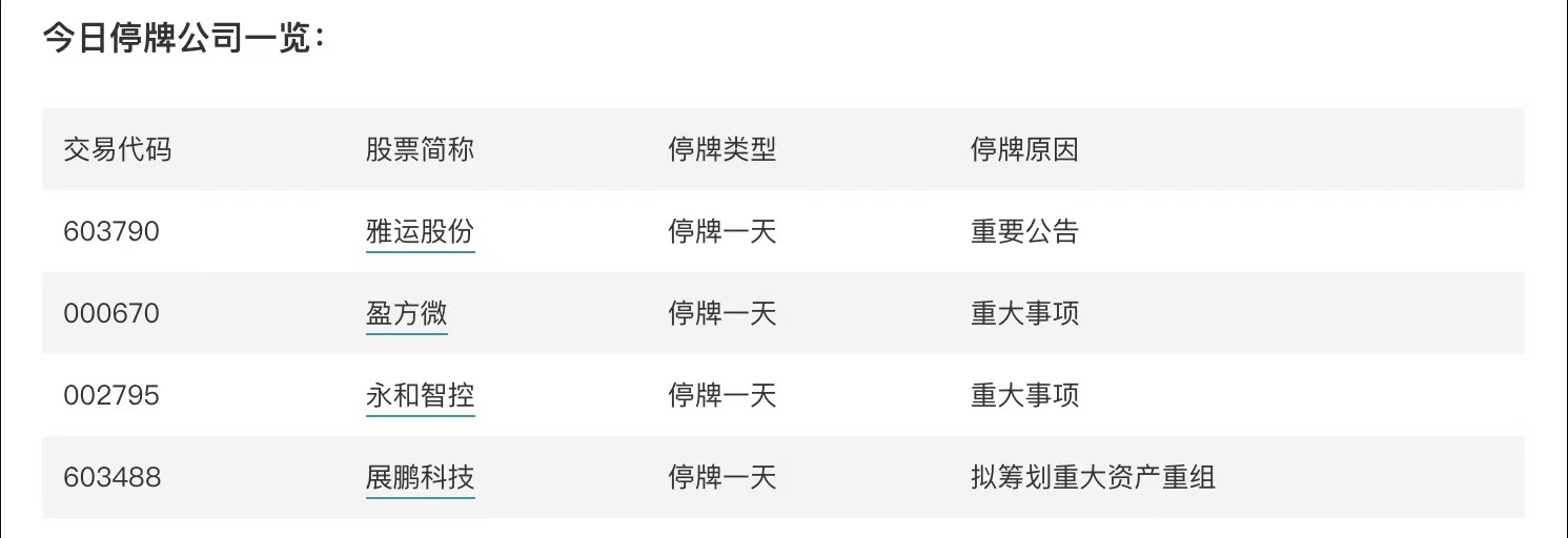 Wind数据显示,11月10日,雅运股份、盈方微、永和智控等4只个股停牌。