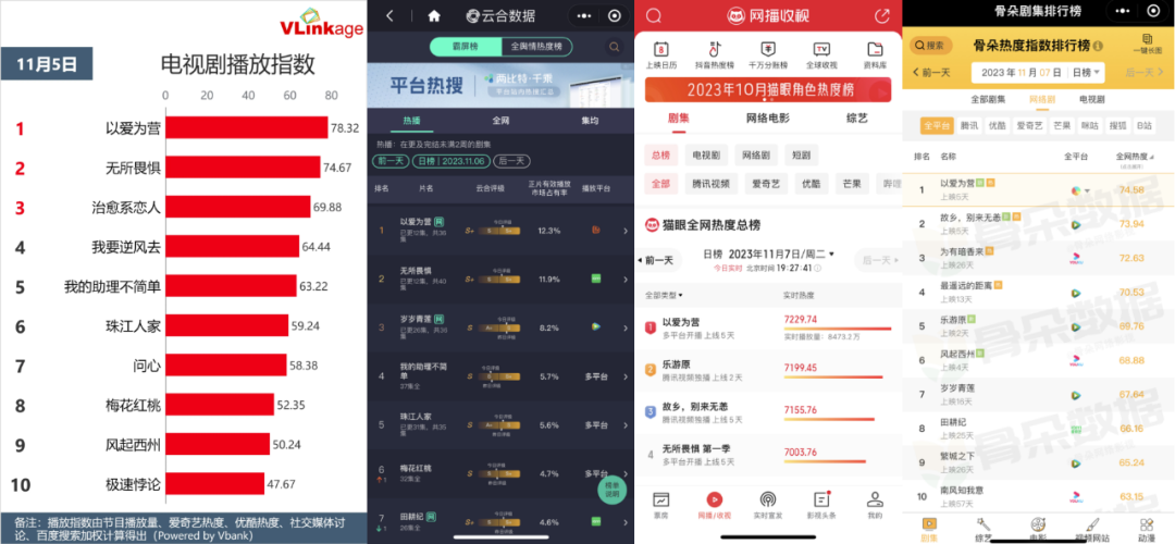 自11月3日播出后,《以爱为营》的全网热度迅速登顶各大数据榜单,相关话题在微博、抖音等社交平台“肆意”收割流量。猫眼数据显示,截止11月8日,该剧微博话题阅读量和抖音话题播放量分别超90亿和45亿,微博热搜上榜条数近1900条。