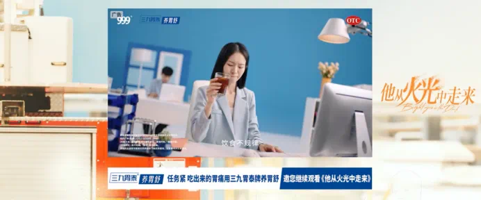 比如在中插广告中投放的医药品牌三九胃泰,结合消防员日常工作中没办法按时吃饭的剧情,为剧集定制了一组消防员的专属文案,引发观众对于小人物生活的共情。