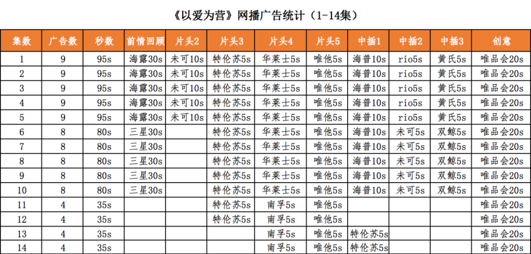 有网友统计了《以爱为营》在芒果TV播出后每一集的广告品牌以及广告出现的次数、露出时长等数据。