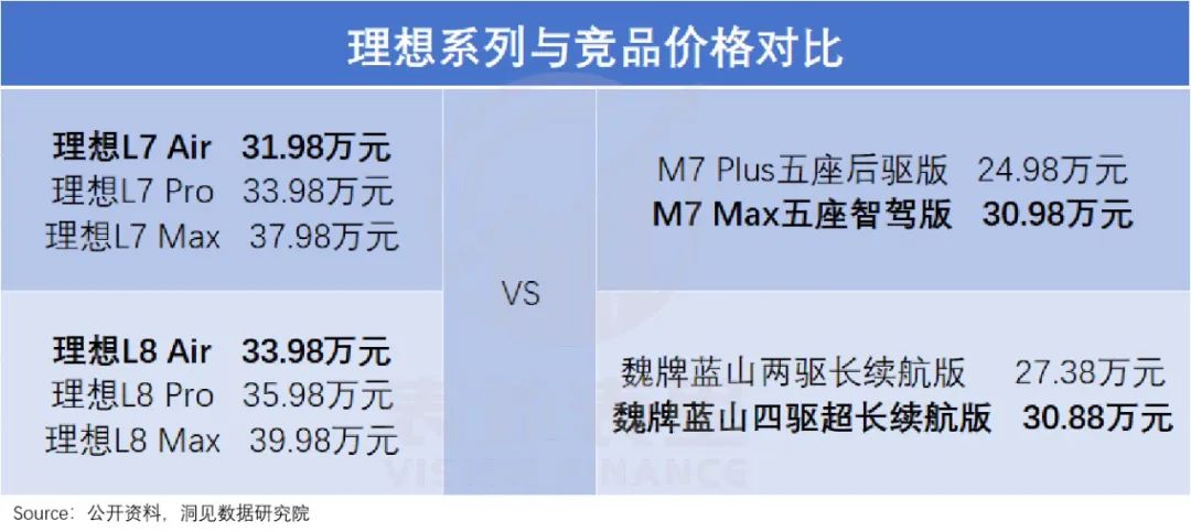 可以看到,理想L7 Air(入门版)的售价,比问界新M7五座智驾款的起售价,还要贵一万;理想L8 Air的售价,则比魏牌蓝山顶配的四驱超长续航版,贵了3万。