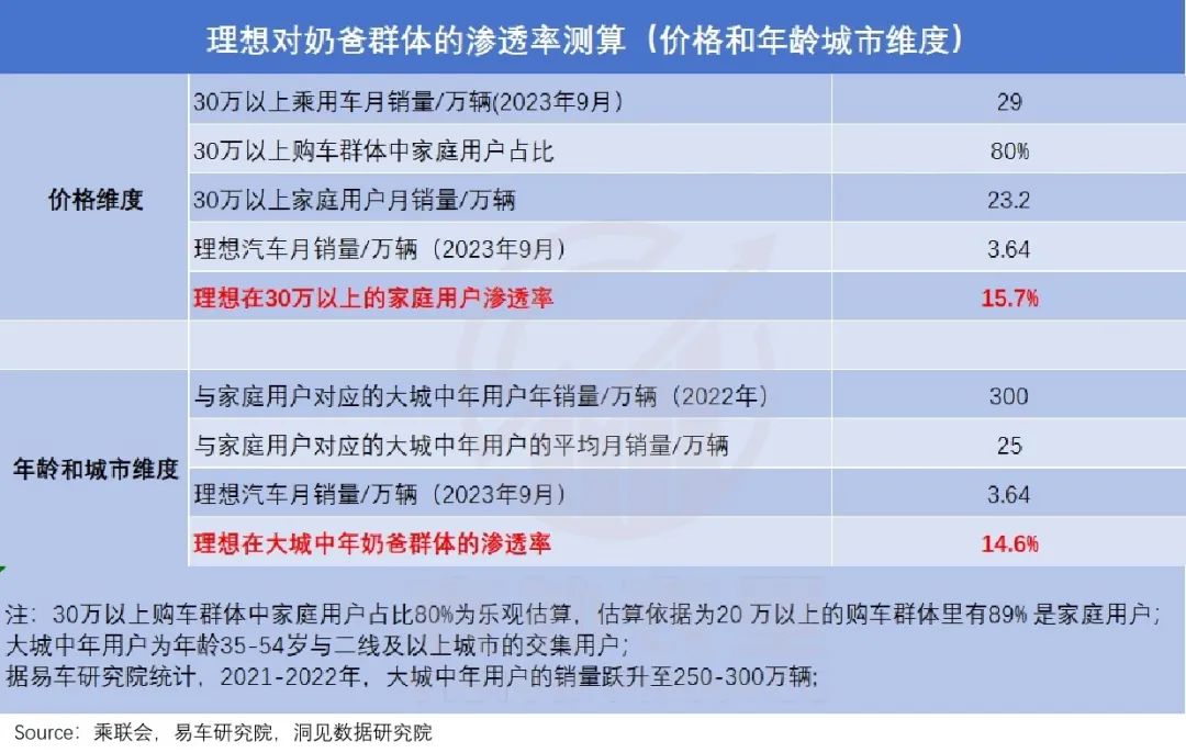 我们测算发现,理想在30万级别的奶爸群体渗透率和在35-54岁&二线及以上的奶爸群体渗透率,均为15%左右。