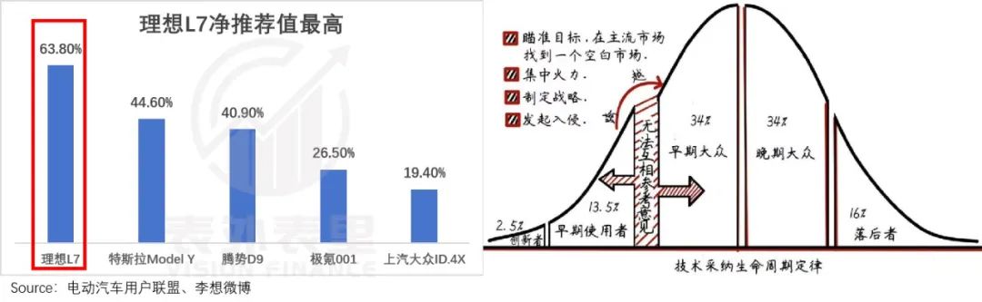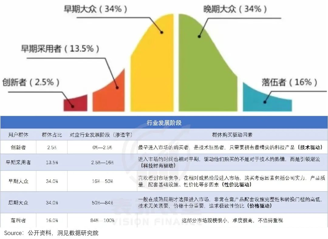 按照《创新扩散理论》的用户群扩展规律,理想已经走过奶爸群体中的创新者(2.5%)、早期采用者阶段(13.5%),到了争取早期大众阶段的拐点。